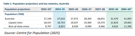 The Center for Population projects that the nation’s population will balloon by 3,860,000 over the 11 years to 2035–36, with most (80%) of this growth occurring in the capital cities, which are projected to swell by 3,080,000 over the 11 years.